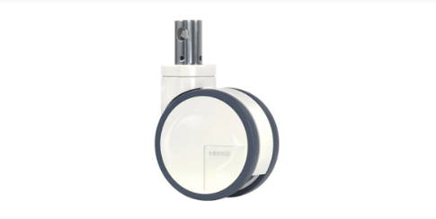 Soporte de polipropileno inyectado de alta resistencia para dos ruedas, equipado con cabezote de giro deslizante con 2 rodamientos de esferas de precisión, ideal para maniobras en áreas estrechas.